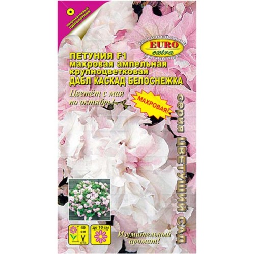 Петуния Дабл каскад F1 Белоснежка махровая – ампельная петуния с восхитительными крупными яркими густомахровыми, постоянно открывающимися, благоухающими цветками. Высота растения до 40 см. Диаметр цветка до 10 см. Растения идеально подойдут для вазонов, кашпо и балконных ящиков в Вашем саду, на веранде и патио.